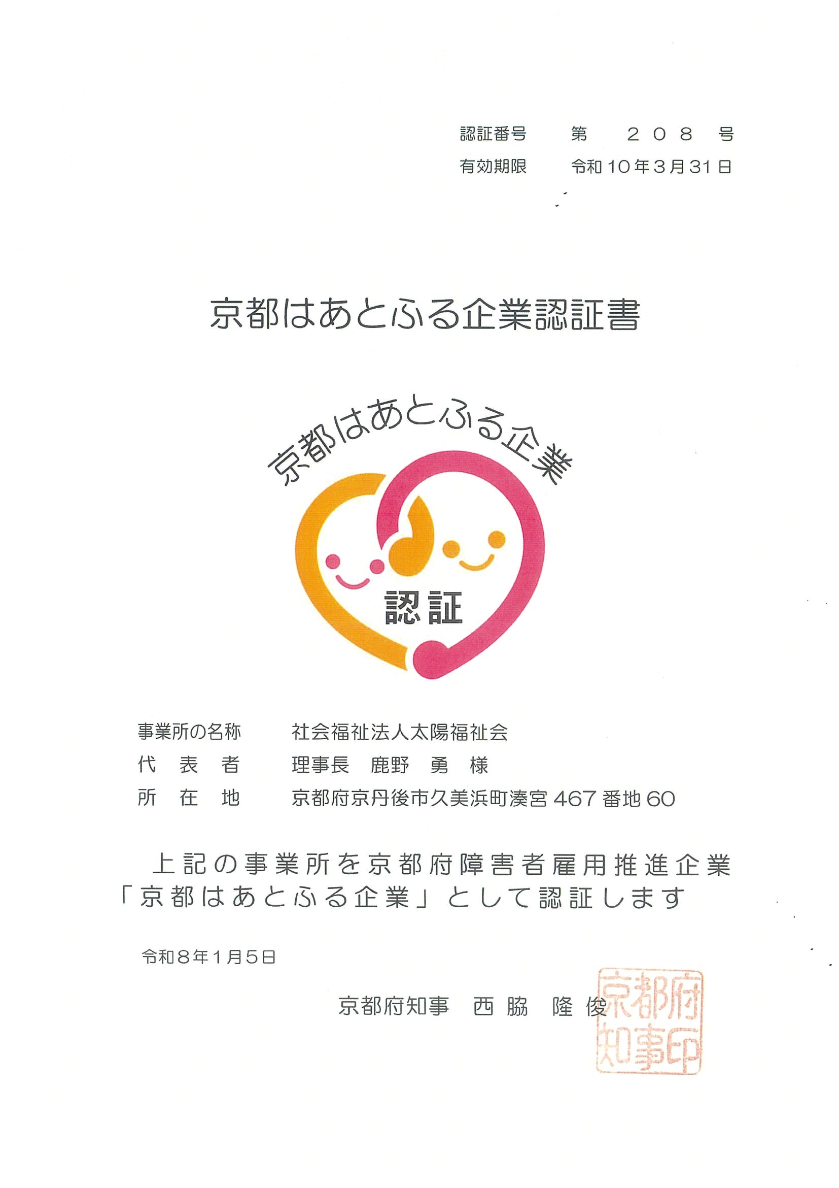 2026年1月5日 社会福祉法人 太陽福祉会は京都府の障害者雇用推進企業「京都はあとふる企業認証制度」の認証事業所に認定されました。